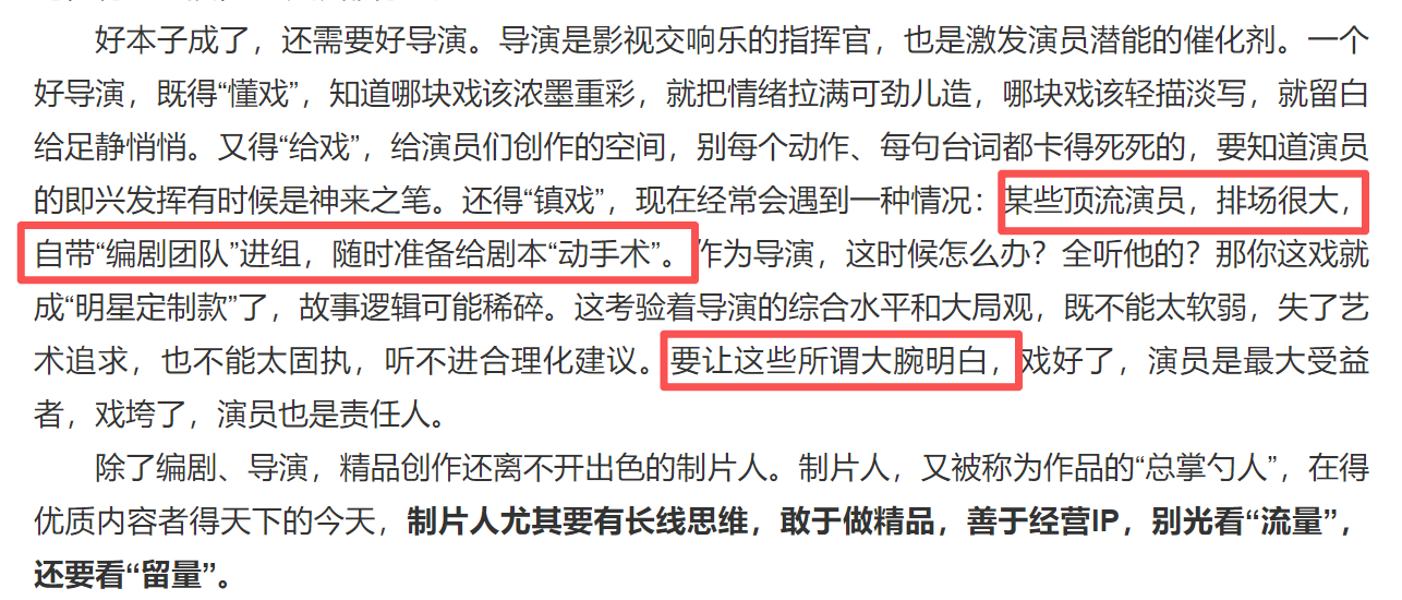 林永健这一段本来是写导演的。他在文中写道“(导演)还得‘镇戏’,现在经常会遇到一种情况:某些顶流演员,排场很大,自带‘编剧团队’进组,随时准备给剧本‘动手术’。作为导演,这时候怎么办?全听他的?那你这戏就成‘明星定制款’了,故事逻辑可能稀碎。”
