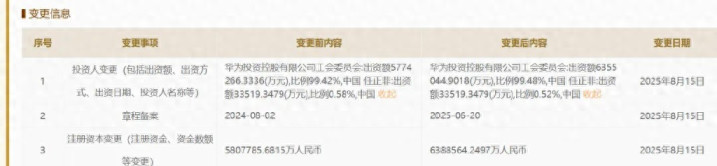 据国家信用信息公示系统显示配资专业网上配资炒股,华为投资控股有限公司(以下简称“华为投资控股”)工商信息于8月15日发生变更,注册资本由约580.78亿元增至约638.86亿元,增加约58亿元,增幅近10%。